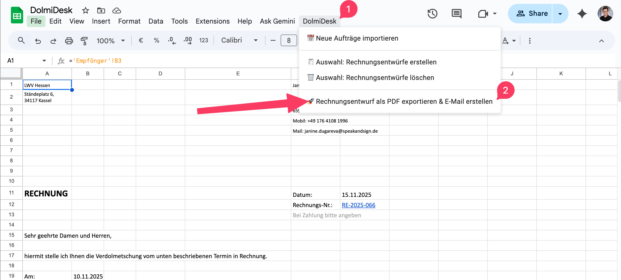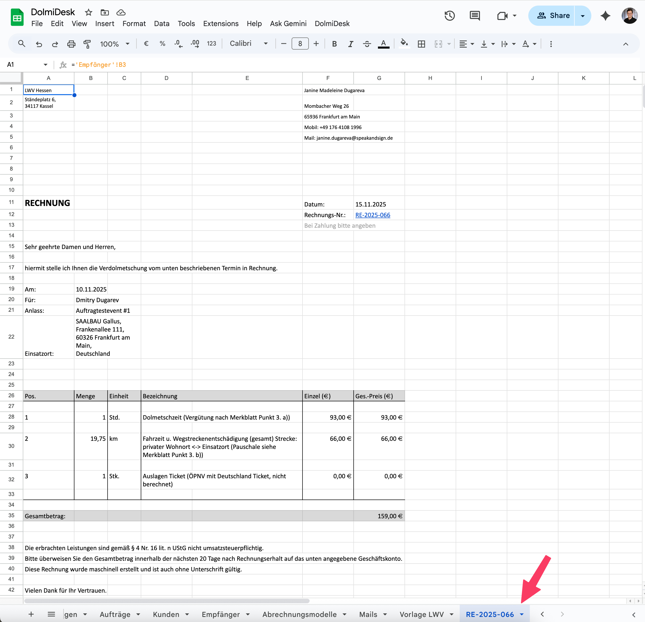 Angenommen, Du hast gerade die Rechnung RE-2025-066 für die "LWV Hessen" erstellt. Das Tabellenblatt ist offen vor Dir.