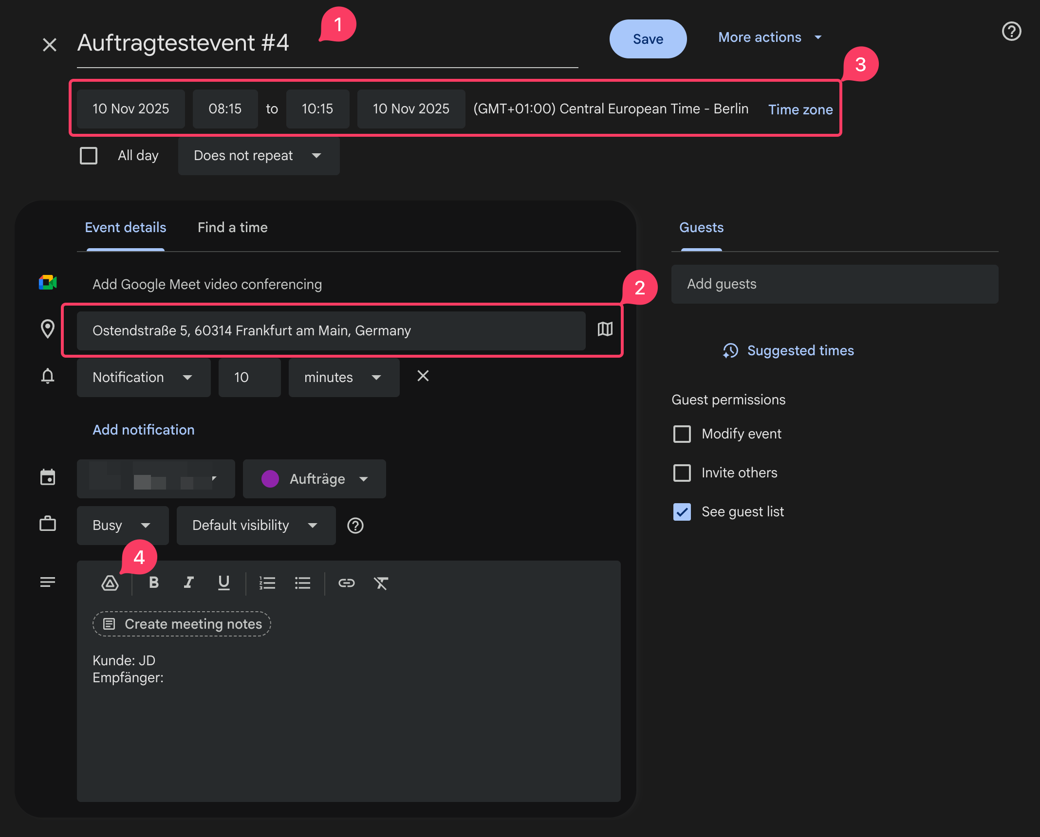 Im Notizfeld des Termins kannst Du Daten übergeben, die Google Kalender nicht kennt. Syntax: Schlüssel: Wert