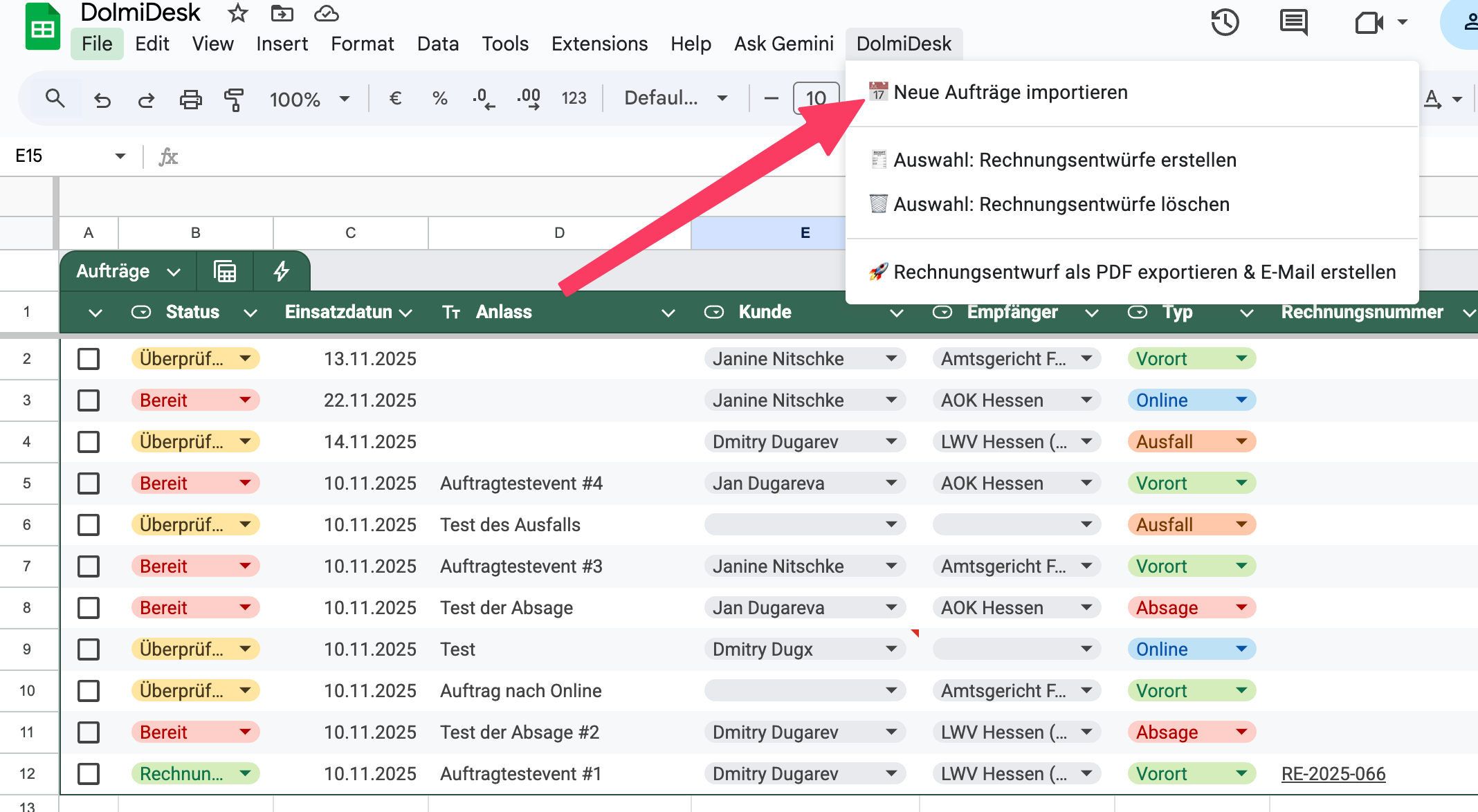Wenn Du auf "DolmiDesk → Aufträge importieren" in der Tabelle klickst, entscheidet das Skript, welche Daten Vorrang haben und wie die Reise berechnet wird.