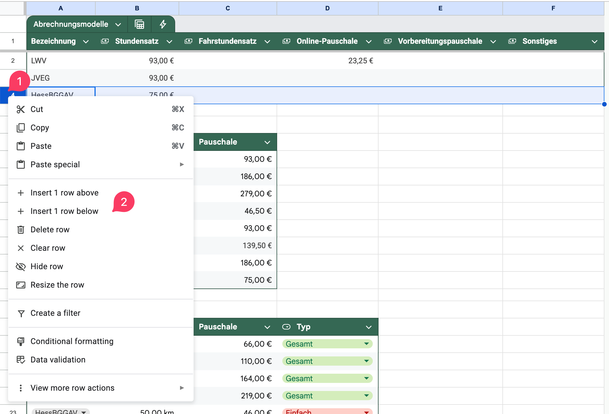 Gehe zur Tabelle Fahrtpauschalen und füge zwei Zeilen hinzu:
