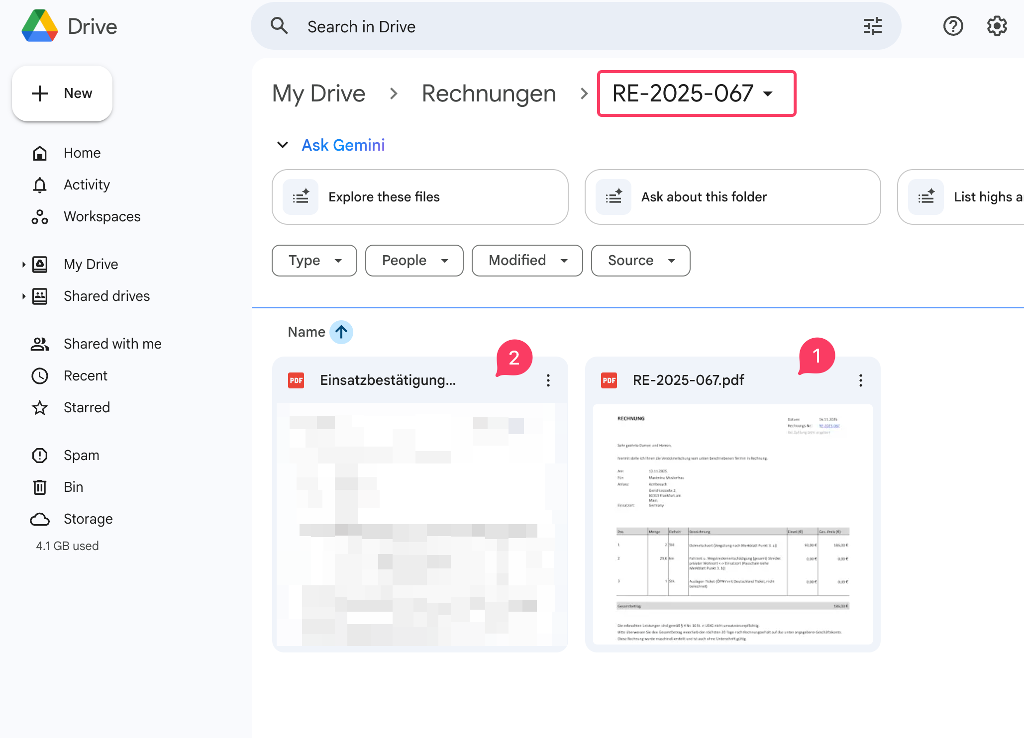 Der Google Drive Ordner mit der exportierten Rechnung und dem Anhang. - Der Tab