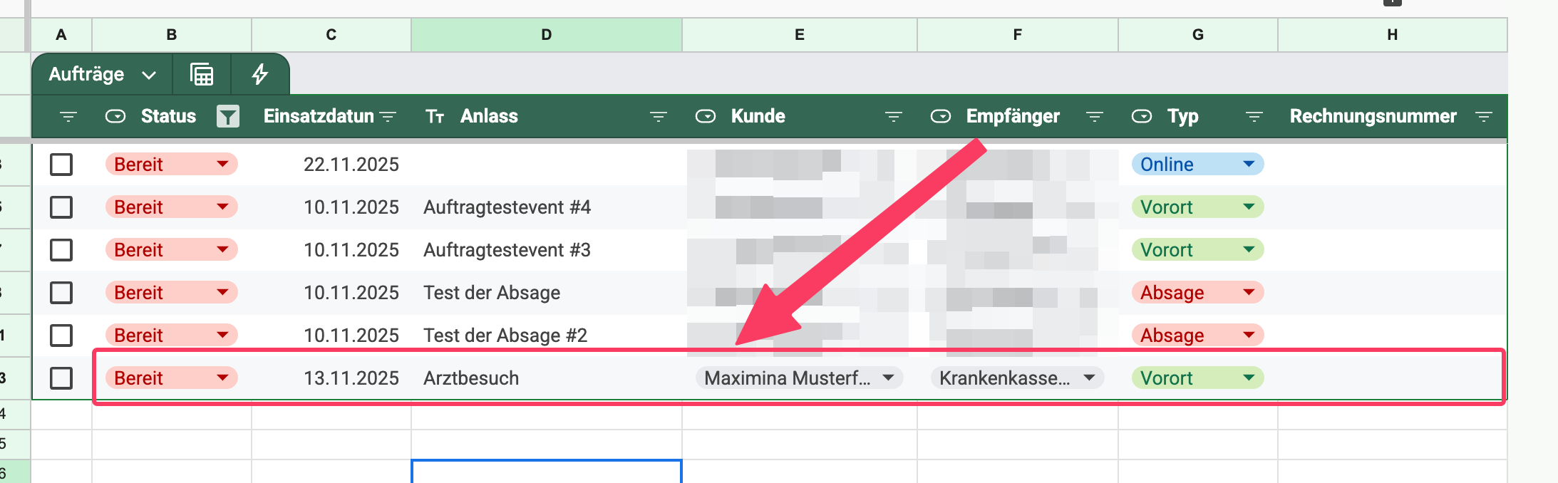 Wenn das Geld da ist, geht Anna in den Tab Rechnungen, sucht die Zeile und ändert den Status manuell auf Bezahlt.