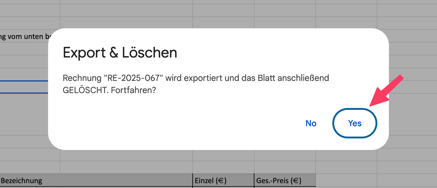 RE-2025-067wurde gelöscht, um die Tabelle aufzuräumen. - In der Tabelle Rechnungen wurde der Status auf Exportiert und die Rechnungsnummer zu einem Link zum Drive-Ordner geändert.